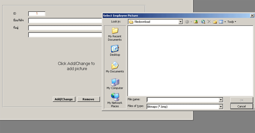 โดยวิธี Browse เลือกไฟล์ที่ต้องการ JPG,BMP เก็บลงฐานข้อมูลเฉพาะชื่อไฟล์